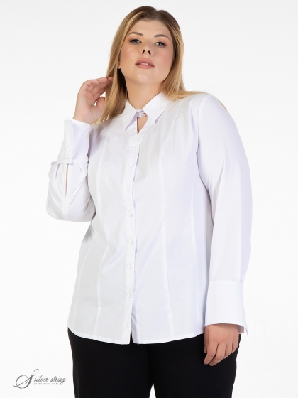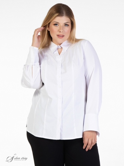Стильная блуза полуприлегающего силуэта, в стиле «Casual», выполнена из однотонной смесовой ткани с высоким содержанием хлопка. Материал отличается бархатистой поверхностью и легким блеском. Модель с рубашечным воротником на стойке и застежкой на пуговицы в цвет ткни. Верхняя часть линии борта слегка отведена и образует V-образный вырез сразу под воротником, что выглядит эффектно как при застегнутой, так и при расстегнутой стойке. Рукав втачной, длинный, с притачной манжетой по низу. Высота манжеты позволяет носить её на отворот, тем самым регулируя длину рукава. В боковых швах обработаны разрезы. Это лаконичная модель, которая притягивает внимание изысканными нюансами и позволит чувствовать себя элегантно при любых обстоятельствах.