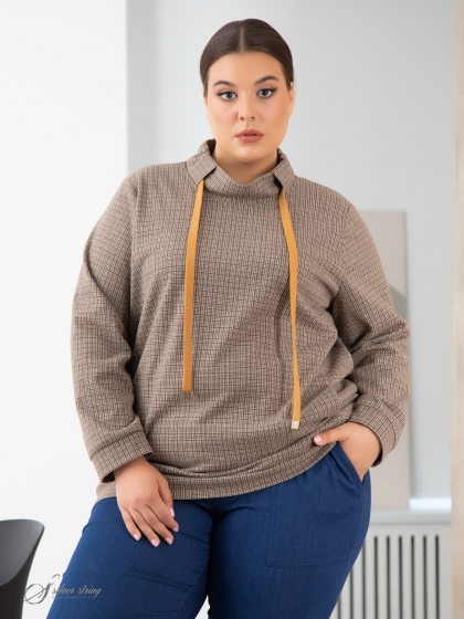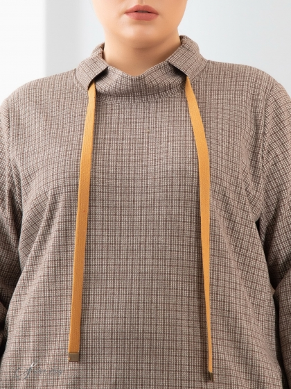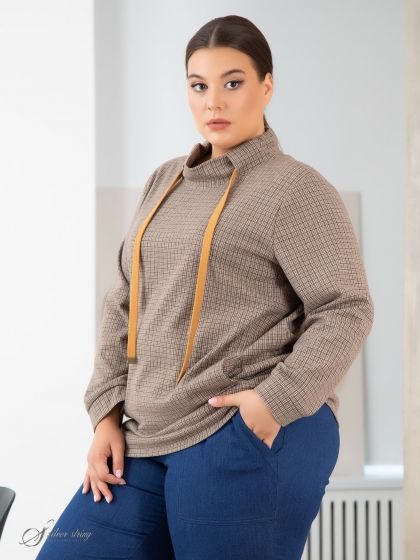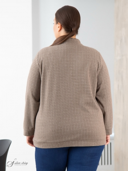 Стильный джемпер прямого силуэта изготовлен из эластичного трикотажного полотна с рисунком в клетку. Модель с длинным втачным рукавом. Манжеты рукавов и притачной пояс по низу изделия выполнены из основного материала. Воротник – стойка состоит из двух частей заходящих друг на друга. По стойке пропущен декоративный шнур затяжка. В рельефных швах полочки обработаны карманы. Эту модель отличает удобство и непринуждённость.