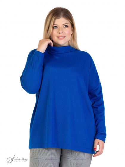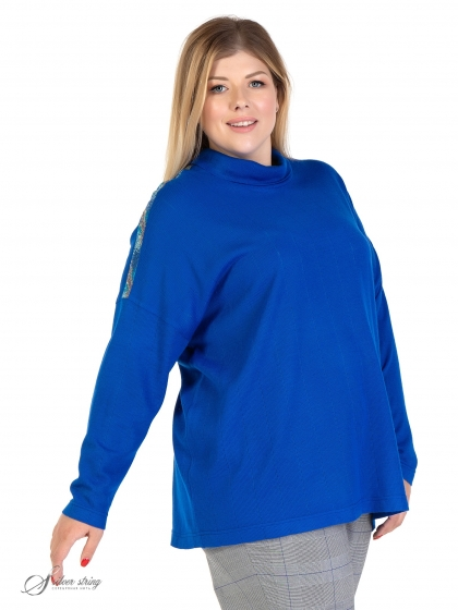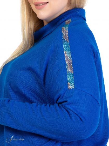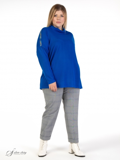 Эффектный джемпер свободного силуэта выполнен из фактурного однотонного трикотажного полотна. Модель с удлиненной линией плеча и воротником - «гольф». Рукав длинный, суженный к низу. Линия плеча декорирована термоаппликацией из миниатюрных страз с анималистическим рисунком. Модель выполнена с учетом особенностей фигуры дам нестандартных размеров, позволяет подчеркнуть их достоинства и завуалировать возможные недостатки.