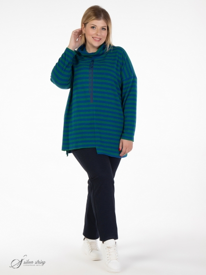 Современный джемпер свободного силуэта выполнен из мягкого трикотажного полотна с рисунком в полоску. Модель с удлиненной линией плеча и воротником - «гольф». Рукав длинный, суженный к низу. Полочка декорирована вертикальной принтованной надписью. При изготовлении принта используется специальный пластификатор, который позволяет рисунку выдерживать длительную эксплуатацию изделия. Модель с асимметричной линией низа: правая сторона полочки укорочена относительно остальных деталей. Такой крой отлично маскирует проблемные зоны, стройнит фигуру и дарит ощущение свободы и комфорта.