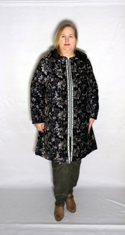 Стильный кардиган-ветровка выполнен из шанель-велюр полотна с интересным принтом. Для отделки использовали тесьму с надписями.