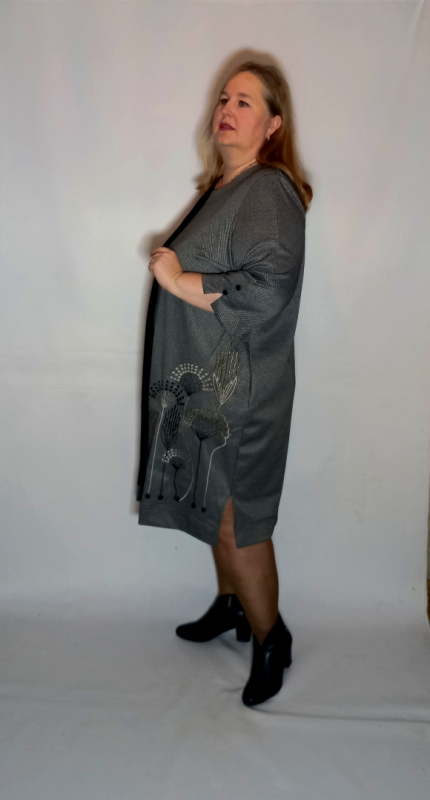 Платье выполнено из плотного трикотажа двух видов : однотонный и с рисунком. Трикотаж приятный, умеренно эластичный