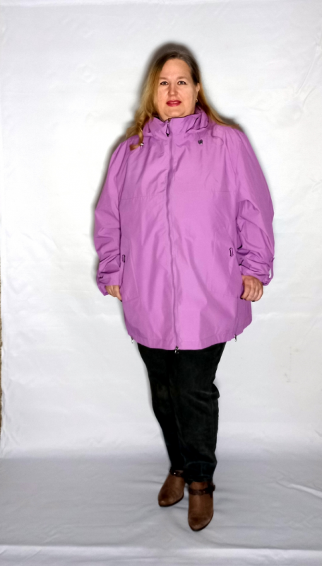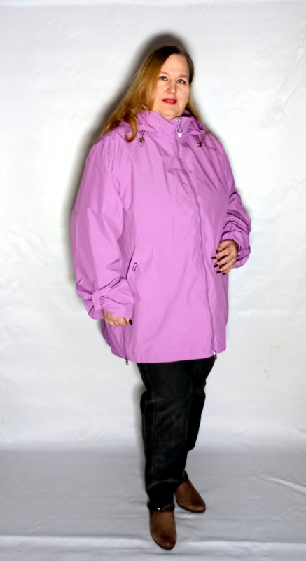 Глубокий капюшон, отстегивается. Внутренняя его поверхность из ткани с рисунком ( такой же декор  на рукавах и на полочке вставка в области карманов.