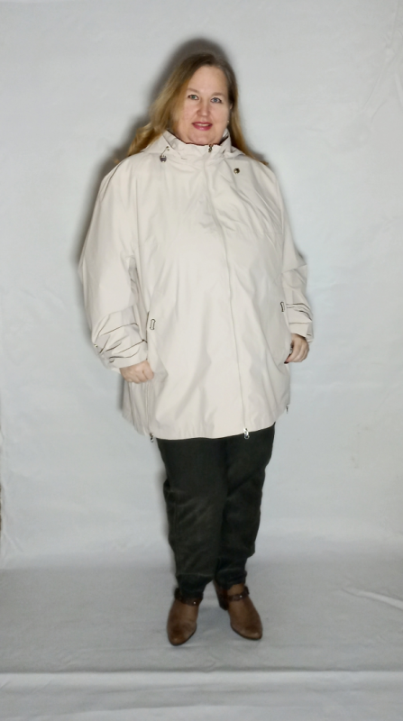 Глубокий капюшон, отстегивается. Внутренняя его поверхность из ткани с рисунком ( такой же декор  на рукавах и на полочке вставка в области карманов.